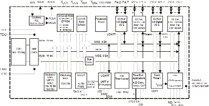 Новый интерфейсный модуль (USART) обеспечивает поддержку последовательных асинхронного и синхронного протоколов обмена— стандартный асинхронный (UART) до 115,2 кбод и последовательный периферийный интерфейс (SPI). Один бит регистра управления определяет режим обмена, причем он может переключаться в любое состояние в зависимости от конкретного приложения. В отличие от предыдущих серий микроконтроллеров MSP430x33x, количество цифровых портов ввода/вывода (I/O Ports) увеличено до 40.