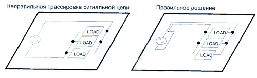 Не следует разносить в пространстве сигнальную и возвратные цепи одного сигнала (рис. 8). Это замечание касается также дифференциальных входных цепей, которые должны иметь одинаковую длину.