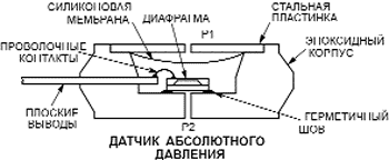 В основе всех датчиков, несмотря на их внешние различия, лежит один и тот же базовый элемент, изображенный на рис. 2. Резистивный чувствительный слой нанесен на диафрагму. В элементе, предназначенном для измерения абсолютного давления, диафрагма с одной стороны герметично запаивается. В датчиках относительного и дифференциального давления через отверстие Р2 диафрагма испытывает давление и с другой стороны корпуса. В этом случае на дифференциальный элемент (с двумя портами) воздействуют разность давлений — Р1 и Р2. Выходной сигнал, таким образом, пропорционален данной разности. Однако следует учитывать, что такой элемент рассчитан на эксплуатацию только при перепаде давления Р1 > Р2. В датчике абсолютного давления измерение давления Р1 производится относительно вакуума.
