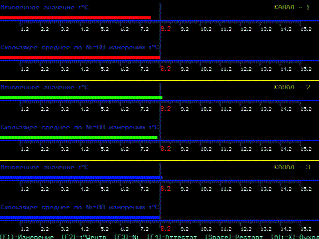 К прибору прилагается еще одна программа, предназначенная для его калибровки или для точного измерения температуры медленно протекающих термических процессов. Она позволяет одновременно наблюдать две шкалы для каждого канала. На первой отображаются мгновенные изменения температуры, а на второй скользящее среднее значение температуры, вычисленное по N измерениям.