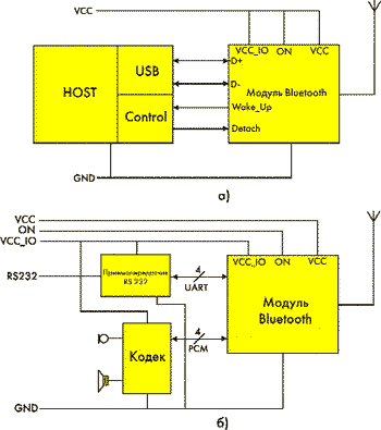 На рис. 2 изображены типовые приложения модуля при использовании интерфейса USB (рис. 2 а) и UART/PCM (рис. 2 б).