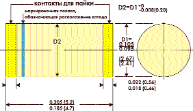 Диоды этой серии выпускаются в оригинальных цилиндрических корпусах для поверхностного монтажа. Они выпускаются только в несимметричном исполнении. Для обозначения катода на корпусе наносится специальная полоса голубого цвета (см. габаритный чертеж TGL41-6.8–TGL41-200A ). График, иллюстрирующий зависимость Ppp или Ipp от T для диодов серии TGL41-6.8– TGL41-200A аналогичен приведенному на рис. 15 графику для диодов серии P6КЕ6,8– P6КЕ440СА.