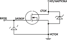 Переходные процессы в затворе МОП-транзистора часто происходят из-за разрядов электростатического электричества (ESD). Установка TVS-диода между затвором и истоком позволит защитить МОП-транзистор от входных переходных процессов. В этом случае рекомендуется устанавливать TVS-диод со значением обратного напряжения, превышающим входное напряжение МОП-транзистора. Для подавления ESD рекомендуется использовать TVS-диоды TRANSZORB® со значением максимально допустимой импульсной мощности (Pppm ) — 400 Вт. Схема, иллюстрирующая эти методы защиты, показана на рис. 33.