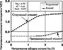 Специфическая реализация данного алгоритма повторяющихся циклов для SSI флэш-элемента представлена на рис. 5. Для каждого цикла программирования напряжение выбранного затвора (SG) устанавливается на уровне Vsg, ток программирования линии битов задается на уровне Ip источником тока. На линию общего истока (CS) подаются импульсы напряжения программирования Vpg, равного Vcs. Во время каждого импульса программирования время программирования tp управляется ключом заданного истока. Импульсы программирования подаются с нарастанием амплитуды от 6 до 12 В с шагом DVpg. Процесс программирования прекращается при достижении значения Vsf. После каждого импульса программирования происходит считывание значения Vsf в элементе (табл. 1). В табл. 2 приведены параметры для работы с элементами памяти. Во время чтения напряжение Vsf истокового повторителя линии битов определяется как заряд плавающего затвора. Данный метод эффективен при измерении отрицательного напряжения на элементе памяти Vt, то есть Vsf ~ -Vt. На рис. 6 и 7 показана зависимость Vsf от Vsg и Vcs соответственно.