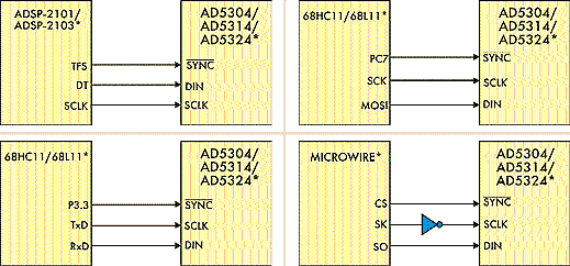 Рис. 11 Способы подключения различных типов ЦСП к ЦАП AD5307/ AD5317/AD5327.