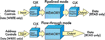 Архитектура синхронного двухпортового ОЗУ оптимизирована для применения в вычислительных сетях (ATM и Ethernet коммутаторы/маршрутизаторы) и системах беспроводной телефонии (базовые станции), обеспечивая следующие синхронные режимы работы памяти: Pipelined (конвейерный), Flow-through (сквозной) и Burst (пакетный). Режимы Pipelined и Flow-through отличаются структурой выходного устройства (рис. 2). В первом случае дополнительный буферный регистр-защелка по выходу (Output register) позволяет организовать конвейерный доступ к данным (одновременно с чтением по предыдущему адресу осуществляется запрос по следующему). Поэтому включение микросхемы двухпортового ОЗУ в режиме Pipelined позволяет сократить общее время обращения к памяти. Единственным недостатком этого режима является задержка на один период сигнала синхронизации при считывании первого слова. Во втором случае (режим Flow-through) считываемые данные непосредственно поступают на выходную шину микросхемы памяти (Output). Это позволяет обеспечить минимальную задержку при считывании первого слова. Однако все последующие обращения к памяти в этом режиме будут проходить за более длительное время, чем в режиме Pipelined. Режимы Flow-through и Pipelined задаются пользователем аппаратно.