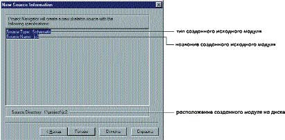 Установка значений всех необходимых параметров создаваемого модуля завершается нажатием клавиши Далее, которая находится в нижней части диалоговой панели (см. рис. 10). При успешном создании модуля открывается информационная панель, показанная на рис. 11. В ней отображается информация обо всех параметрах нового модуля. При необходимости можно изменить значение любого из них, вернувшись к предыдущей диалоговой панели с помощью кнопки Назад. Для завершения процесса создания нового исходного модуля следует нажать кнопку Готово (см. рис. 11). После этого автоматически производится запуск программы пакета, используемой для создания и редактирования соответствующего типа исходного описания проектируемого устройства. В окно исходных модулей добавляется пиктограмма, соответствующая типу нового модуля.