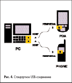 Здесь уместно рассказать о соединителях, используемых в устройствах OTG, тем более что выше уже упоминались некоторые из них. Вернемся немного назад к обыкновенному USB. Для соединения USB-устройств использовались соединители типа «A» прямоугольной формы (этот соединитель вставляется в компьютер) и соединители типа «В» квадратной формы (обычно вставляется в USB устройство). Схема такого соединения приведена на рис. 4.