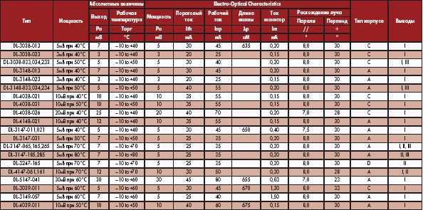 Таблица 3. Лазерные диоды для инфракрасной области спектра