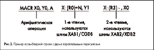 На рис. 2 показан формат ассемблерной строки, из которого видно, что за один машинный цикл DSP56F800 может выполнять одну или две параллельные пересылки между памятью данных и входными регистрами DATA ALU. Такая возможность увеличивает эффективность программы, снижает размер программного кода.