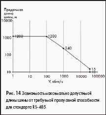 RS-485 (см. рис. 2 [1]). На приемном конце линии вычисляется разность между сигналами. При дифференциальной передаче удается в значительной мере подавить помеху, поэтому основным достоинством дифференциального интерфейса RS-485 является высокая помехоустойчивость. Недостаток RS-485, как и прочих дифференциальных интерфейсов, — относительно высокая стоимость, а также сложности при выполнении парных согласованных каскадов передатчиков и приемников. Область применения RS-485 в координатах «длина кабеля — скорость передачи данных» показана на рис. 3. Данный интерфейс может быть реализован в дуплексном режиме, с четырьмя информационными проводами и в полудуплексном режиме — с двумя.
