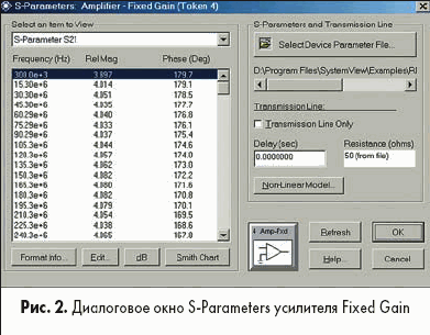 Для выбранного усилителя S-параметры берутся из текстового файла, созданного пользователем. В SystemView для этих целей используется формат Touchstone ® (Touchstone —зарегистрированная торговая марка корпорации Agilent).