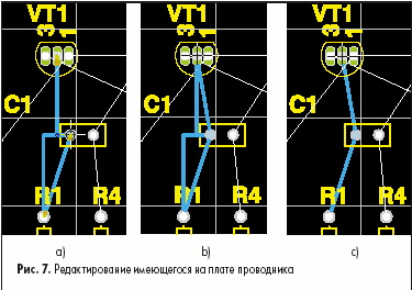 - Проводник, связывающий конденсатор C2 и транзистор VT2 теперь может быть прорисован без изгибов, поэтому в режиме интерактивной трассировки перерисуем его заново, как описано ранее. Старый рисунок проводника при этом автоматически удалится (рис.18c).