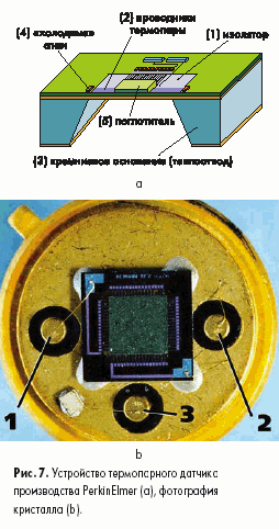 Современная полупроводниковая промышленность позволяет разместить сотни термопар на площади в несколько квадратных миллиметров. Датчик такого типа обладает высокой чувствительностью, малой инерционностью и невысокой стоимостью при массовом производстве. Компания PerkinElmer разработала уникальную техно огию массового производства как одиночных термопарных датчиков, так и их матриц. Использование полностью автоматизированного производственного процесса позволяет добиться минимального расхождения параметров одной серии термопарных датчиков.