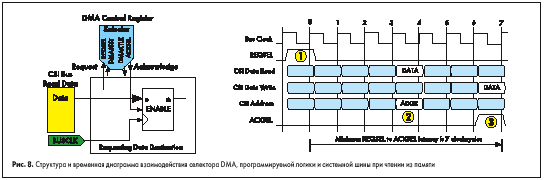 Структура и временная диаграмма взаимодействия селектора DMA, программируемой логики и системной шины при чтении из памяти