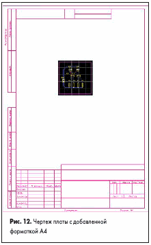 - Переместим чертеж платы в центр рамки или в любое другое подходящее место. Для этого с помощью мыши выделим в окне охвата всю плату, наведем указатель мыши на любой из выделенных объектов, щелкнем левой кнопкой мыши и, удерживая ее, переместим плату в новое место (рис.12).