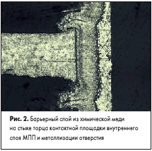 Поскольку химическое меднение — процесс автокаталитический, неизбежно металлизируются и вся поверхность фольги наружного слоя, и торцы контактных площадок внутренних слоев. Это приводит к нежелательному расходу реагентов, а для многослойных плат — к наличию непрочного барьерного слоя из химической меди между металлизацией отверстий и торцами внутренних слоев (рис.2).