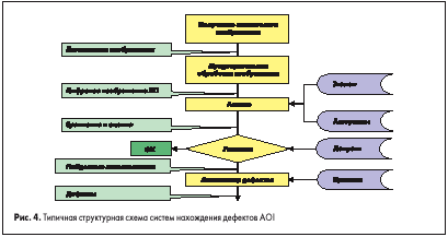 - Анализ — производится проверка изображения с использованием алгоритмов нахождения дефектов, осуществляющих сравнение подготовленного изображения с эталонным и работающих в пределах разрешенных допусков.