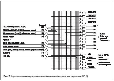 Полученный на выводах прибора PSD адрес вместе с сигналами управления поступает на блок программируемой л гики дек дирования (Decode PLD — DPLD). На вх д матрицы AND PLD дек дирования прибора PSD813F2 поступает 73 сигнала, в том числе и сигналы управления и адреса (рис.2). В PLD декодирования адреса дек дируются и выходы PLD дек дирования адресуют соответствующие сектора основной Flash-памяти, вторичной памяти или SRAM. Гибкость адресации каждого сектора памяти обеспечивают по три терма произведения на каждый сектор. Расширение диапазона адресов обеспечивается 8-разрядным регистром страниц, позволяющим д 256 крат увеличить диапазон адресации. Посредством регистра страниц может быть адресована не только встроенная память и I/O прибора PSD, но и внешняя память и устройства внешней периферии. Логические связи PLD дек дирования конфигурируются средствами пакета PSDsoft.