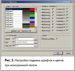 Обратите внимание, напротив имени листа в окне PCB Printout Properties стоят включенные опции, предписывающие добавлять к изображению объекты компонентов, расположенных на разных сторонах платы (Top, Bottom, Double Sided), а также выключенные опции отображения отверстий (Holes), зеркального отображения (Mirror) и подмены векторных шрифтов. Сами TrueType-шрифты, с помощью которых выполняется подмена, задаются в окне Preferences (рис.5), вызываемом нажатием кнопки Preferences.