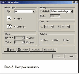 Здесь в поле Printer Paper задается формат бумаги и ориентация, в поле Scaling — масштаб печати, в поле Corrections — поправочные коэффициенты масштабирования по осям X и Y, в поле Margins — отступы и центровка, а поле Color Set — цветовой набор.