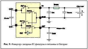 - Включение линейного регулятора LDO перед входом питания преобразователя (рис.8) приводит к схеме, эффективно подавляющей пульсации в остальной части системы. LDO работает с меньшими номиналами конденсаторов, чем эквивалентный по эффективности пассивный LC-фильтр: например, МАX8860 LDO на 300 мА (корпус — 8-выводной µМАX) требует включения на входе и выходе конденсаторов 2,2 мкФ; а семейство МАX8863-4 линейных регуляторов на 120 мА (корпус — SOT23) требует включения на входе и выходе только керамических конденсаторов 1 мкФ. Однако LDO должен иметь рабочий ток, не менее чем вдвое превышающий выходной ток преобразователя с накачкой заряда.