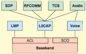 В основе всего, как видно из схемы, лежит Baseband protocol. Baseband protocol определяется физическими характеристиками радиоканала. Logical Link Control & Adaptation Layer Protocol (L2CAP) является базовым протоколом передачи данных для Bluetooth. Baseband protocol позволяет устанавливать синхронные Synchronous Connection-Oriented (SCO) и асинхронные Asynchronous Connection-Less (ACL) соединения. L2CAP, как видно из схемы, работает только с асинхронными соединениями. Также из схемы видно, что многие протоколы и службы более высокого уровня используют L2CAP как транспортный протокол. В полном соответствии с идеологией Bluetooth L2CAP является простым протоколом, который предъявляет минимум требований к вычислительным мощностям и размеру оперативной памяти устройств, которые его используют.