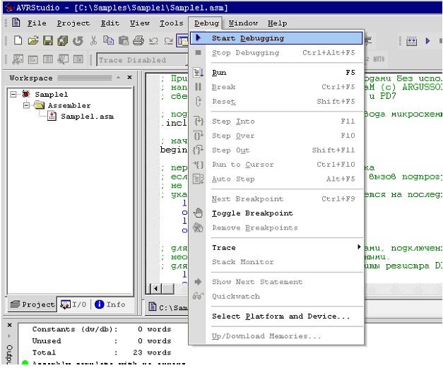 В принципе, мы уже получили выходной файл в формате .hex, который уже можно загружать в микросхему и наблюдать перемигивание светодиодов. Однако, цель статьи – показать полный цикл работы в среде AVR Studio, поэтому мы переходим к стадии отладки. Это делается командой \Debug\Start Debugging.