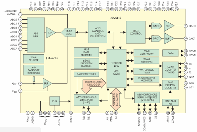 Микроконвертор ADuC842 хорошо подходит для решения задач обработки сигнала. Он обладает быстрым 12-разрядным АЦП и другими встроенными высокопроизводительными аналоговыми периферийными устройствами, имеет быстрое ядро типа 8052, 62 кбайт встроенной флэш-памяти программ и еще некоторые полезные функциональные узлаы (рис. 4).
