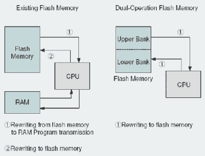 Двухрежимная Flash память позволяет выполнять перезапись содержимого одновременно с выполнением программы из Flash памяти, устраняя потребность в перемещении программы в RAM (см. Рис 1 и Рис.2). Следовательно, одним из преимуществ двухрежимной памяти стало исключение возможности потери кодов, перемещенных в RAM, при отказе питания и, кроме того, исключаются затраты времени на перегрузку кодов программы.