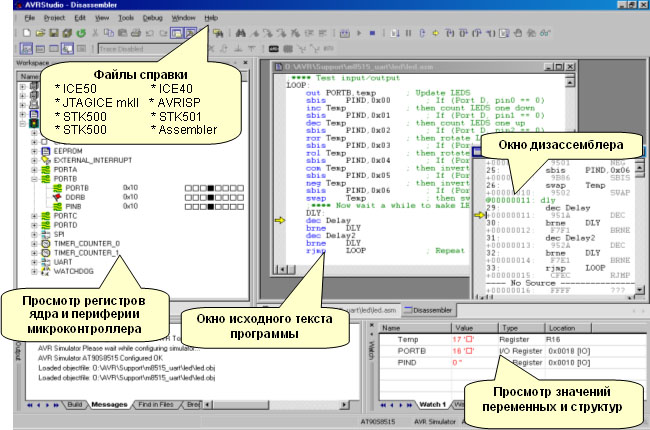 Написание программы в AVR Studio производится на языке ассемблер. Система команд микроконтроллера описана в упомянутых выше руководствах по применению в документе AVR Instruction Set либо в файле справки, встроенном в AVR Studio (меню Help \ AVR Tools User Guide \ AVR Assembler), в котором содержатся достаточно подробные комментарии к каждой команде.