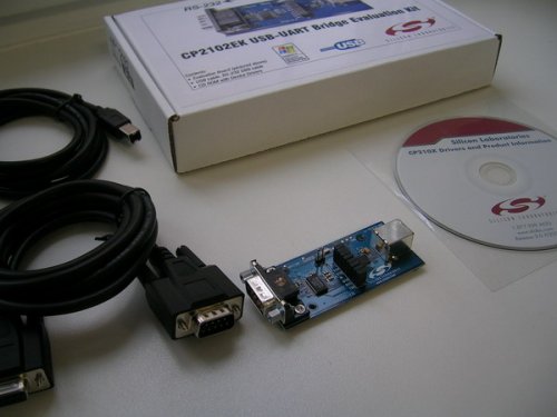 В состав оценочного набора входит целевая плата с распаянным мостом и преобразователем уровней RS-232 <-> TTL, набор кабелей и диск с готовым к установке драйвером.