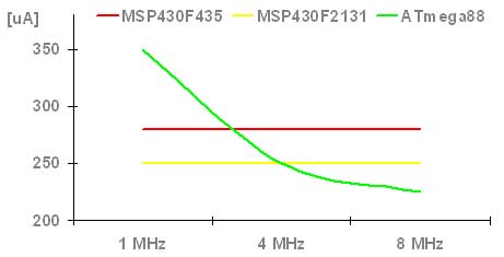 Приведенный на рис. 1 график показывает, что на высоких тактовых частотах AVR выигрывает у своего соперника по энергопотреблению - MSP430 от TI.