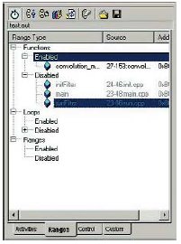 Перейти на вкладку Ranges (рис. 23) и перетащить мышкой функции, для которых будет производиться профилирование, из папки Disabled в папку Enabled (рис. 22). В примере профилирование производится для функций runFilter() и convolution(). На вкладке Custom выбрать размерность профилирования. В рассматриваемом примере профилирование будет производиться в тактах процессора. Для этого ставится галочка напротив позиции Cycles (рис. 24).