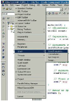 Рассмотрим, как реализовать отображение обрабатываемого сигнала в виде осциллограммы. Вначале необходимо запустить окно визуализации данных. Для этого в главном меню следует выбрать пункт View, в нем опцию Graph --> Time/Frequency…(рис. 7).