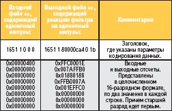 При подключении тестирующих файлов через точки зондирования их формат должен быть изменен. Раньше это были двоичные файлы, являющиеся простой последовательностью отсчетов сигнала в двоичном представлении. В этот раз входной и выходной файлы имеют текстовый формат, где первой строкой идет заголовок, а в последующих строках представлены данные в 32-разрядном целочисленном виде. Пример таких тестовых файлов приведен в таблице. Входной файл содержит единичный импульс с амплитудой 1024, а выходной — реакцию на него (импульсную характеристику) рассматриваемого в статье примера фильтра.