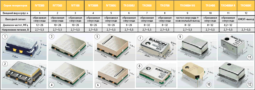 Линейка продукции компании Rakon состоит из нескольких десятков серий кварцевых генераторов, наиболее яркие представители которых перечислены в таблице 1. Для компенсации дрейфа частоты генераторов производителем используются следующие технологии: